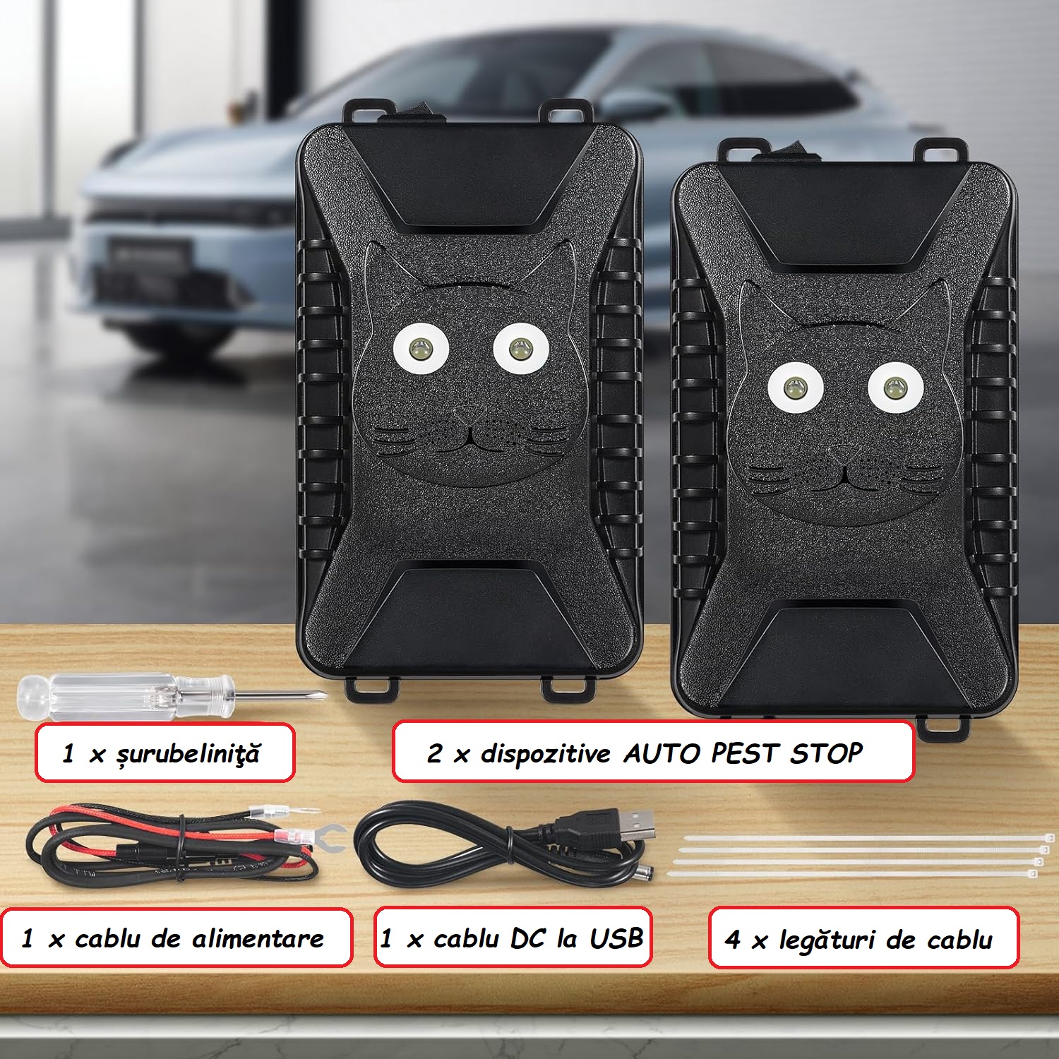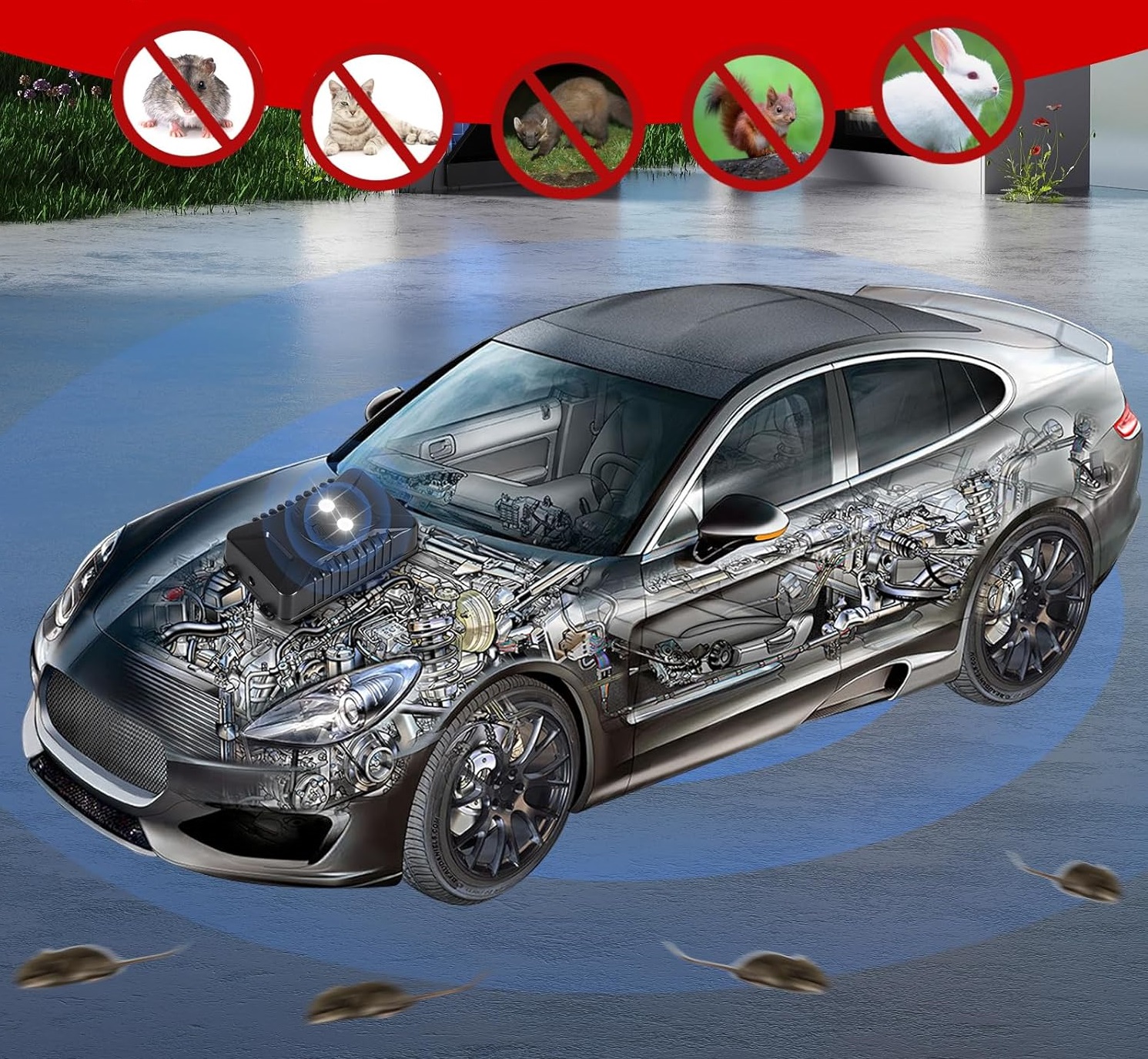 Dispozitiv cu ultrasunete schimbătoare la frecvența 18kHz-36kHz, abia perceptibile de urechea umană, ce îndepărtează rozătoarele și alte animale dăunătoare mașinii dumneavoastră. Emite, de asemenea, flash-uri strălucitoare. Include un senzor de vibrații, care va comuta dispozitivul pornit, atunci când vehiculul este staționat. Va intra în standby în momentul când detectează o vibrație prin pornirea vehiculelor.