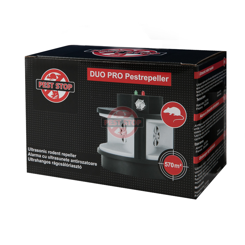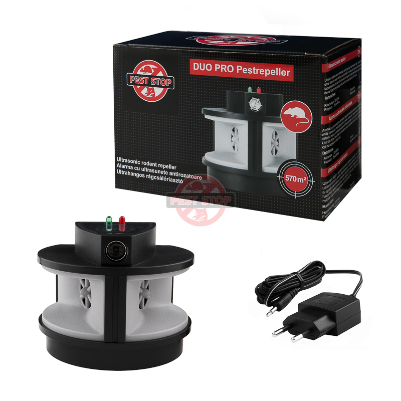 DUO Pro Pestrepeller - este un dispozitiv anti-rozătoare ce emite unde ultrasonice aleatorii,  cu o frecventa intre 30000 si 65000 Hz la difuzoarele cu ultrasunete si 25000 Hz la tweeter . Caracterul unic al ultrasunetelor emise de aparat loveste asupra sistemului nervos si auditiv al rozatoarelor, obligindu-le sa plece. Caracteristica aleatorie a ultrasunetelor emise serveste pentru a evita posibilitatea obisnuirii rozatoarelor cu undele ultrasonice respective. Avantajul acestui dispozitiv este autonomia sa - nu trebuie schimbate frecventele periodic, acest lucru se intimpla automat. Aparatul poate fi utilizat pentru combaterea rozătoarelor în spaţii închise. Acest dispozitiv Anti-rozătoare poate fi utilizat în zone de producţie diferite (depozite, fabrici, magazine, restaurante) şi la domiciliu.